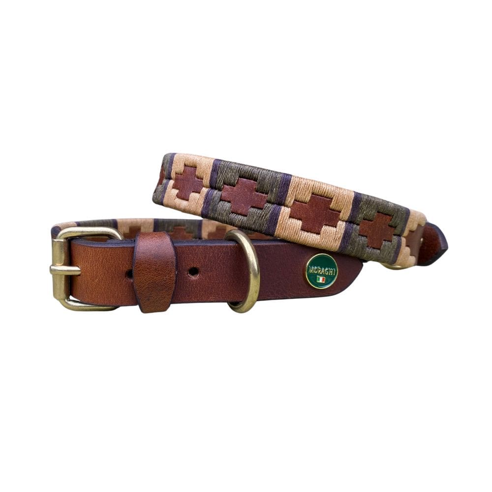 Prachtig handgemaakte donkerbruine polo halsband. Olijfgroene- en zandkleurige vlakken worden van elkaar gescheiden door een donkerbruine verticale lijn.