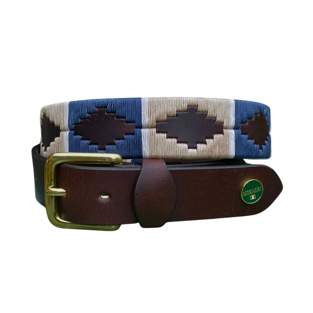 Een mooi klassiek ontwerp voor polo riem Sarmiento. De riem is gemaakt van bruin tuigleer met een koperen gesp. De wax garens zijn verdeeld in beige en donkerblauwe vakken welke afgewisseld worden door een naturel gekleurde streep.