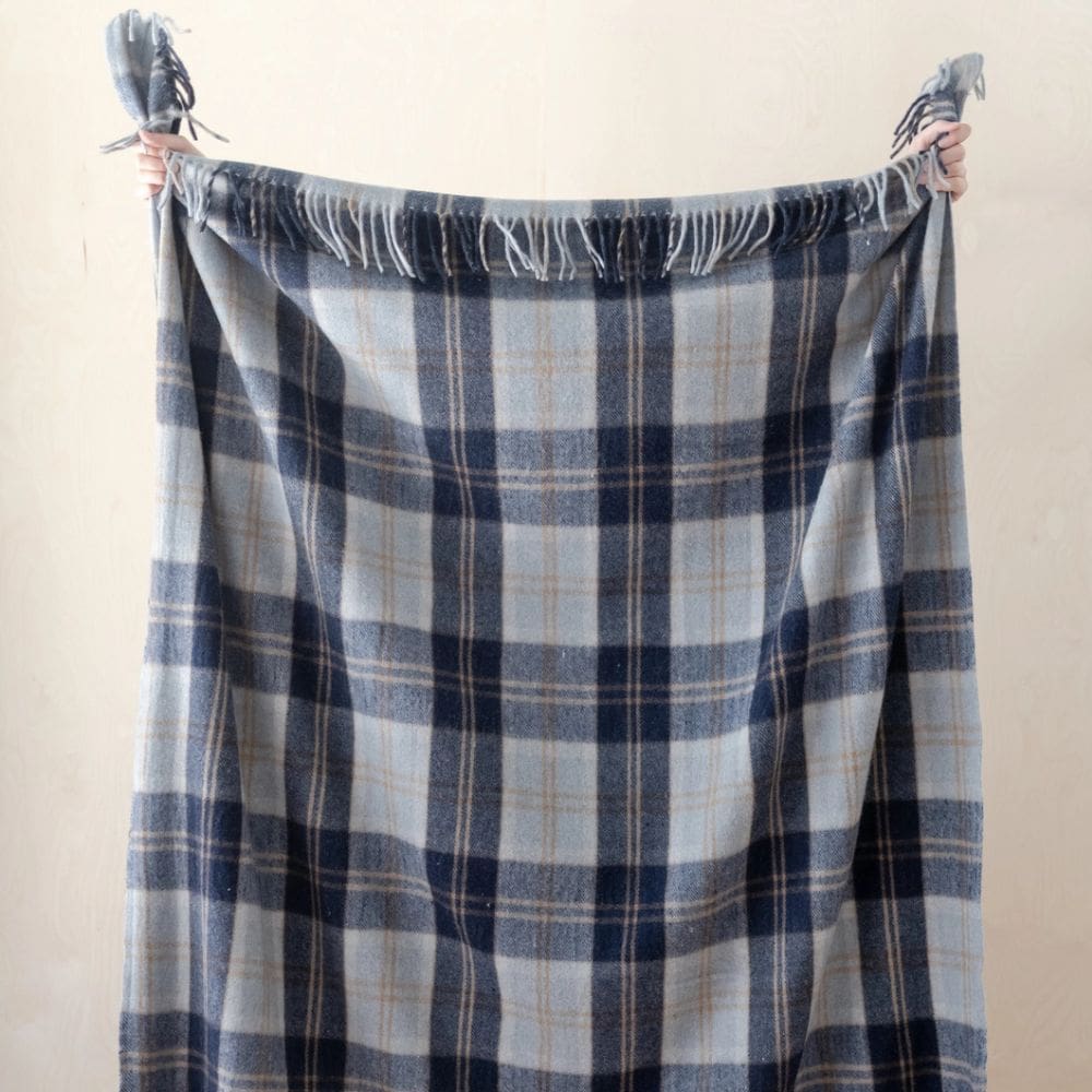 Prachtige deken uitgevoerd in de Bannockbane Silver tartan ruit. Mooie combinatie van zilvergrijs met donkerblauw.